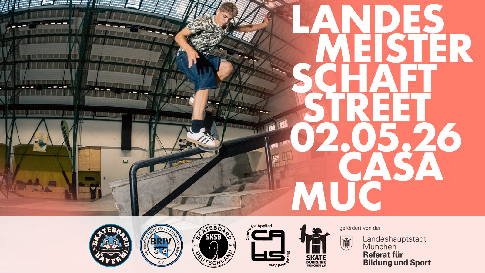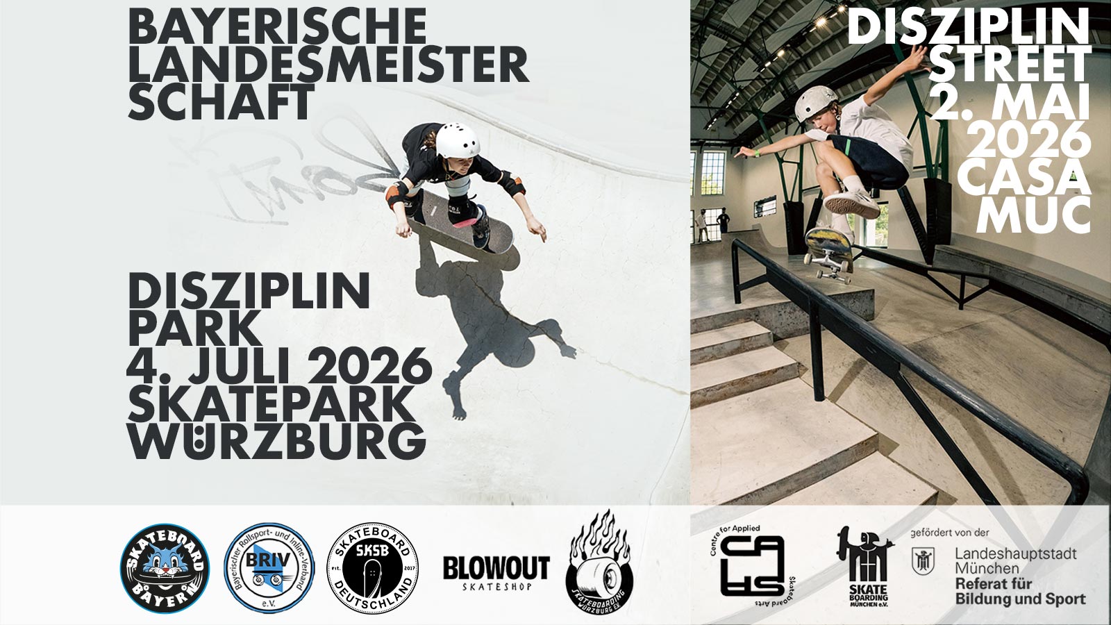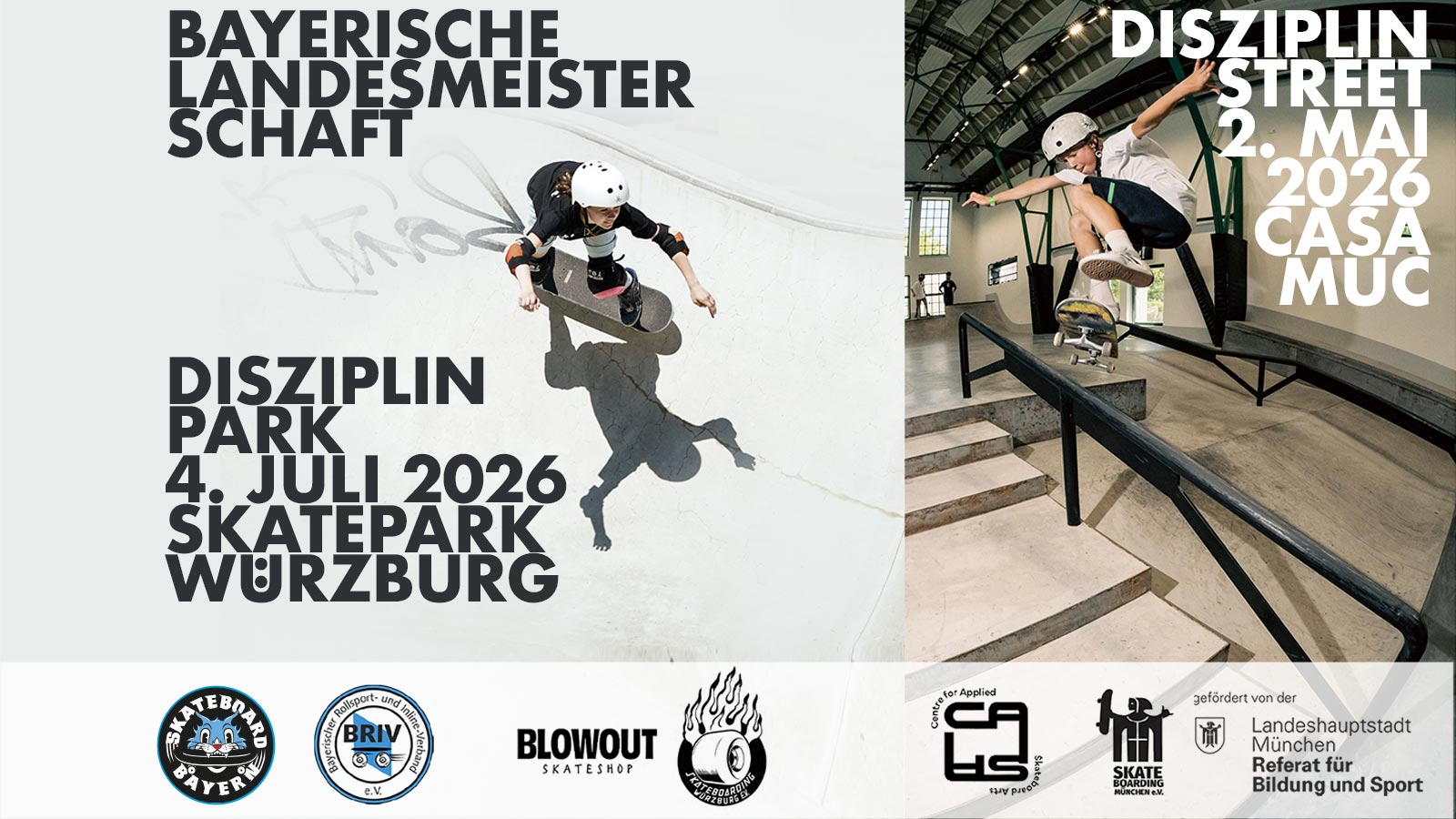 Ab sofort könnt ihr euch direkt für die Landesmeisterschaften anmelden. Am 02.05. findet wieder in der einmaligen Street-Section der CASA München der Kampf um den bayerischen Meistertitel und Wildcards für die DM in Leipzig statt. Und kurze Zeit später könnt ihr euch im Bowl der Stadt Würzburg direkt an den Mainauen battlen. Save the date: 04.07.2026.