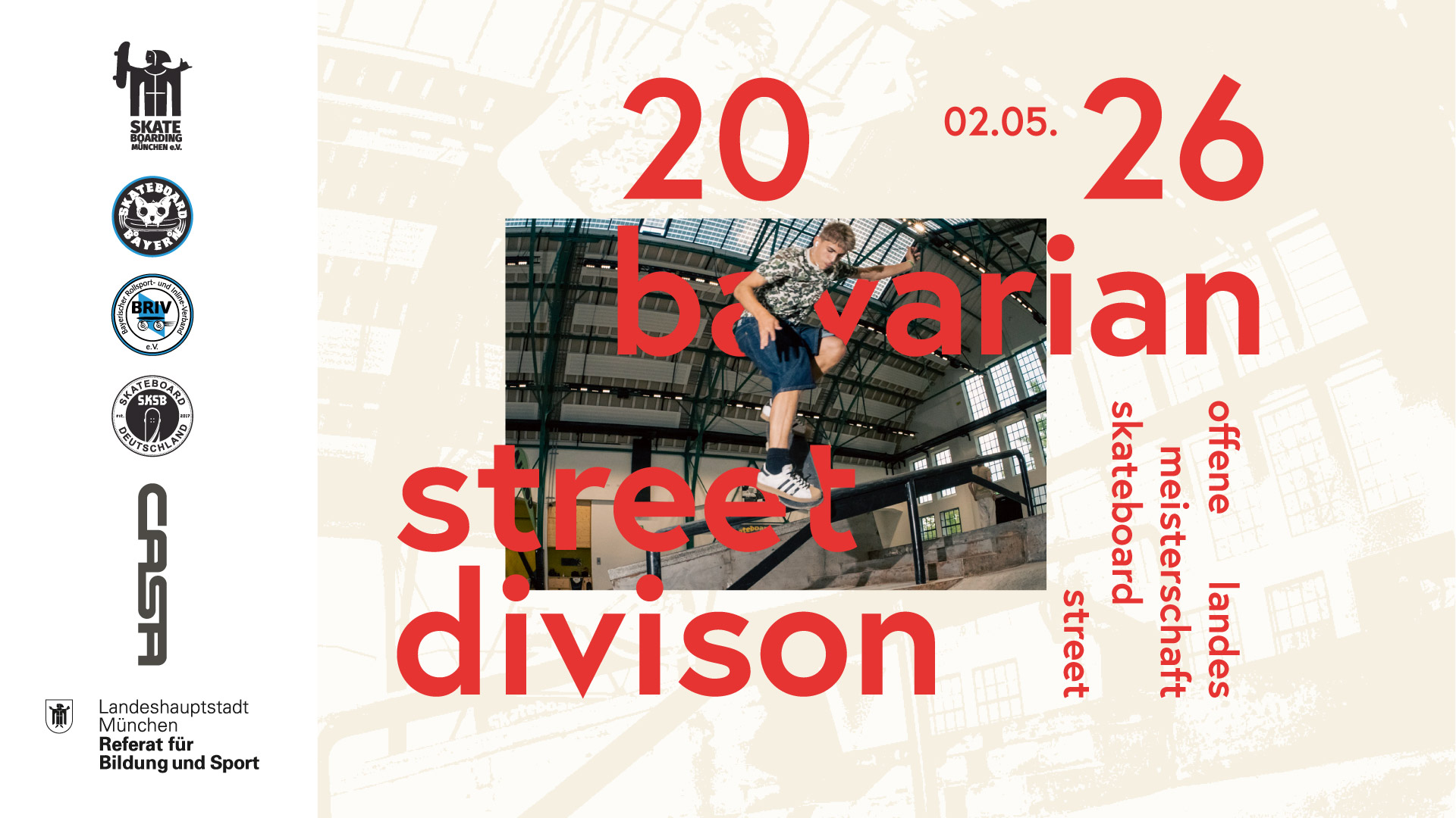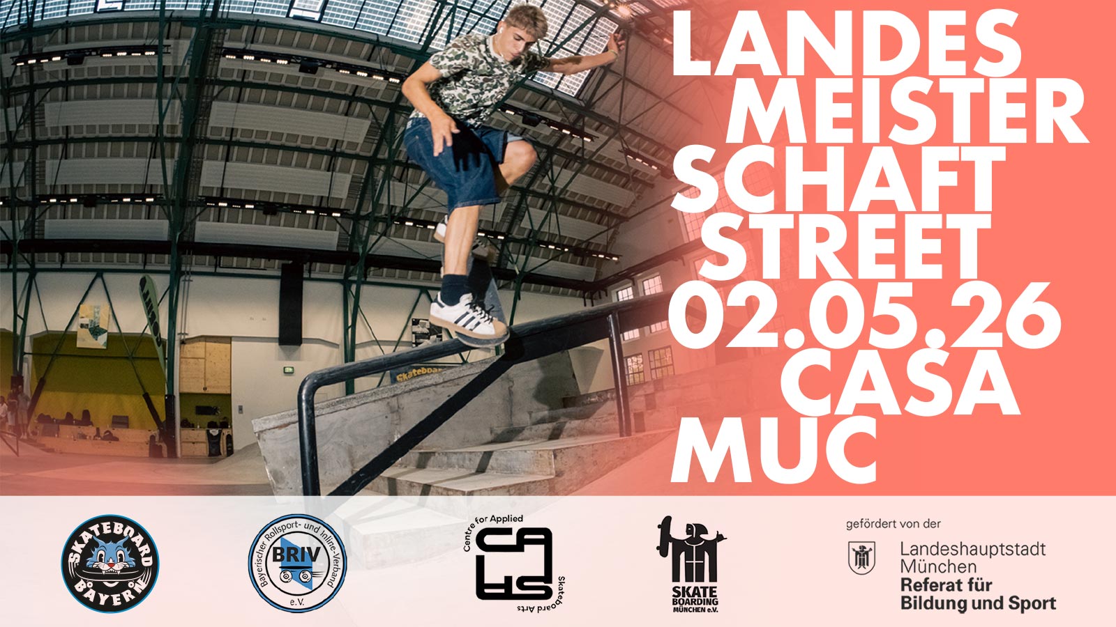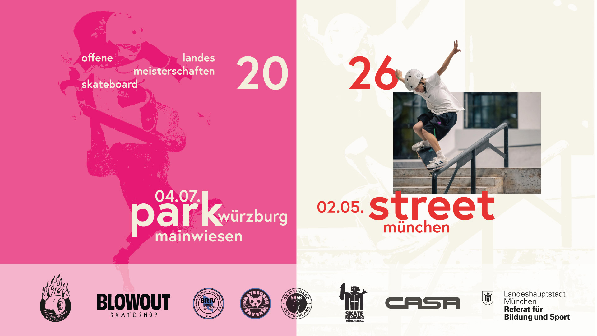Ab sofort könnt ihr euch direkt für die Landesmeisterschaften anmelden. Am 02.05. findet wieder in der einmaligen Street-Section der CASA München der Kampf um den bayerischen Meistertitel und Wildcards für die DM in Leipzig statt. Und kurze Zeit später könnt ihr euch im Bowl der Stadt Würzburg direkt an den Mainauen battlen. Save the date: 04.07.2026.